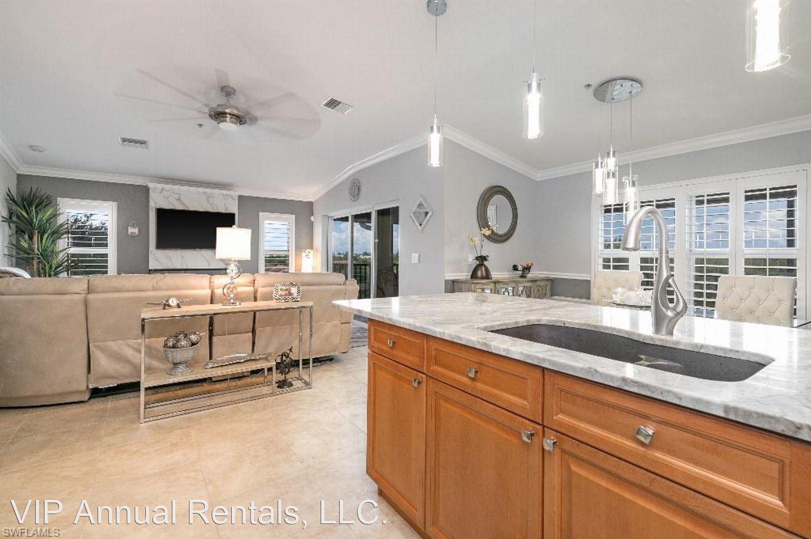 3 bedroom 2 bathroom Vacation Rental - Turn-Key, luxury condo available for a seasonal vacation rental. This lovely condo offers 3 bedrooms, 2 bathrooms, and an attached 2 car garage. Convenient access with a semi-private elevator, which opens up directly to the foyer. Beautifully furnished, built in electric fireplace, new paint, crown moulding, oversized baseboards, and oversized kitchen cabinets with lovely granite counter tops. The lanai is large enough for entertaining and equipped with a granite dry bar, and TV, enjoy the beautiful sunsets SWFL has to offer. Fisherman's Cove is located minutes from beaches, and downtown. The community offers a Clubhouse offering billiards, community heated salt water pool, Bass stocked mangrove ponds, walking trail, and fully equipped fitness center. Ask about availability today! Guests to pay $11.5% state & Local tax, $75 booking fee, $1500 security deposit, $350 pre-paid cleaning fee, $4300 rent for off season & $4800 for peak season, $100 HOA application fee, and $30 per person Background check fee. RATES AND AMENITIES SUBJECT TO CHANGE DEPENDING ON TIME OF YEAR, OR LENGTH OF STAY.